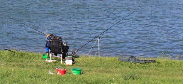 Nicht nur der Spaziergänger besieht sich das Rheinufer. An seinem Rand sitzen die angelberechtigten Fischer das AVK. Dank deren auf wenig Bewegung und Ruhe bedachten Jagdmethode, wird die friedliche Atmosphäre nicht gestört.