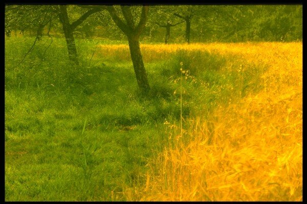 Das älteste Bild habe ich voran gestellt. Es zeigt einen Ausschnitt aus der Kirchau der 80er Jahre. Es steht für einen damals noch lebhaften Wechsel zwischen Feld und Wiese mit Hafergetreide und Obstbäumen.